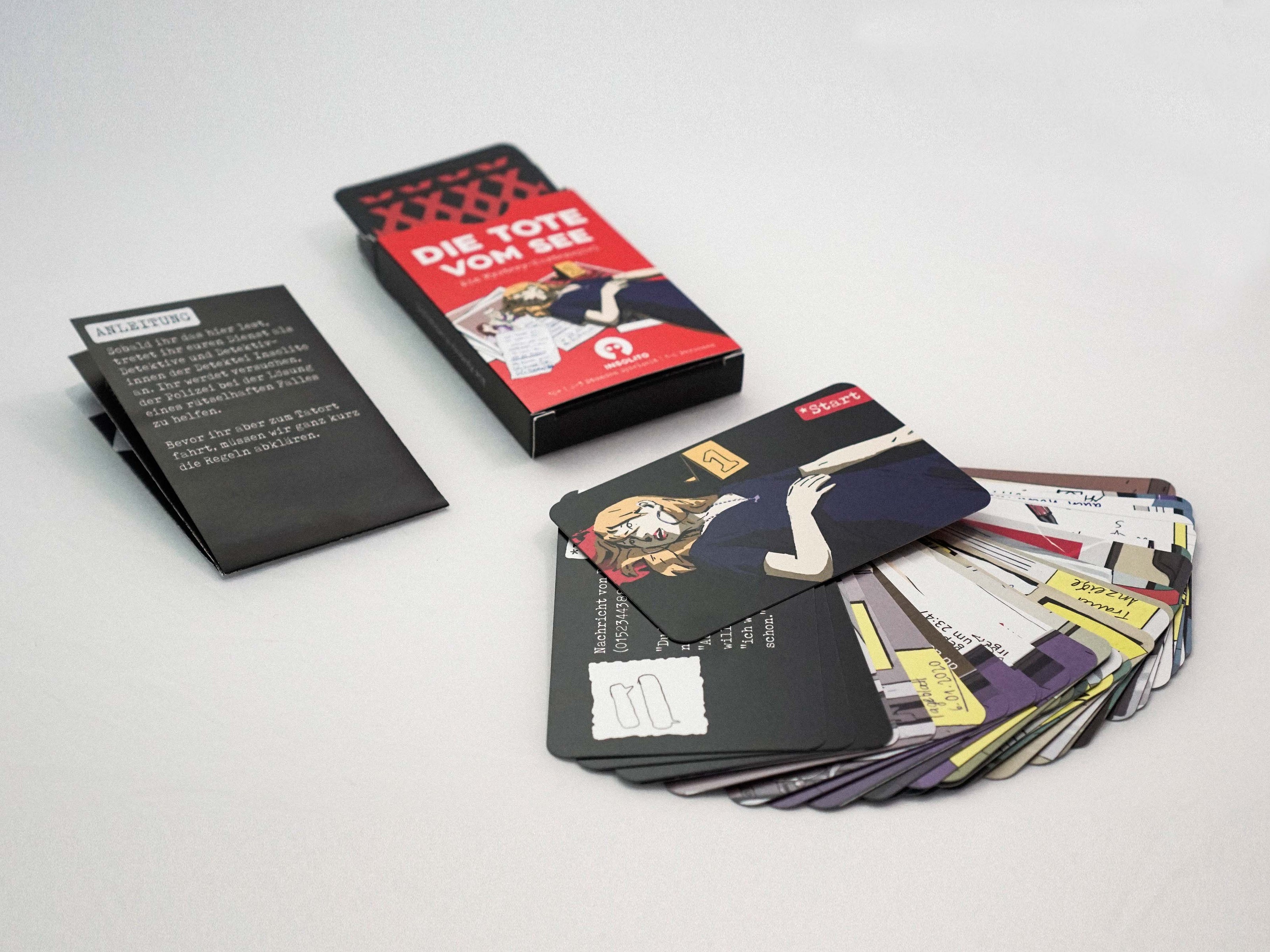 Eine Leiche im See, eine Tatwaffe und viele Verdächtige. Was ist passiert? Erlebt einen spannenden Spieleabend mit Freunden lüftet das Geheimnis der Toten Frau im See.